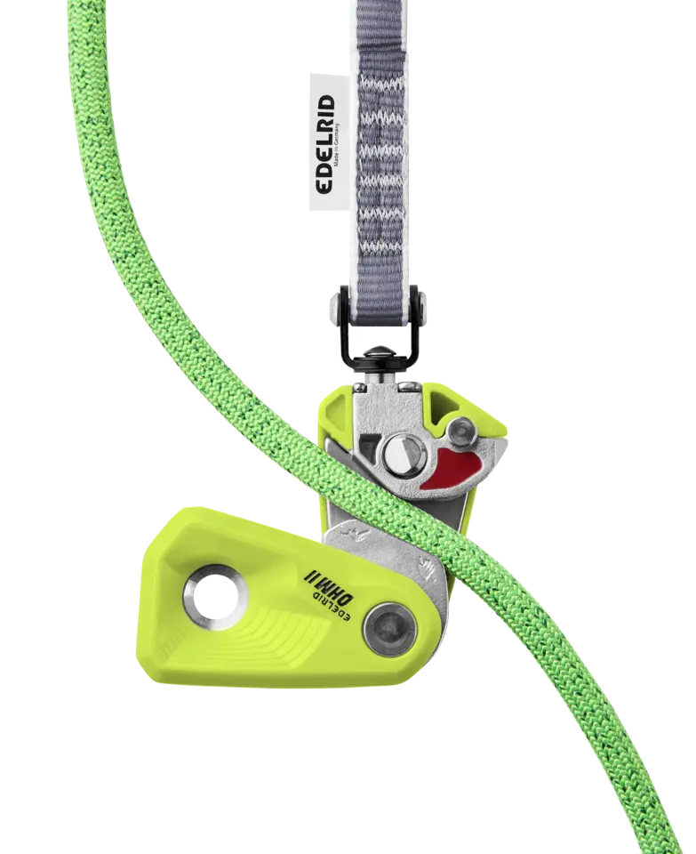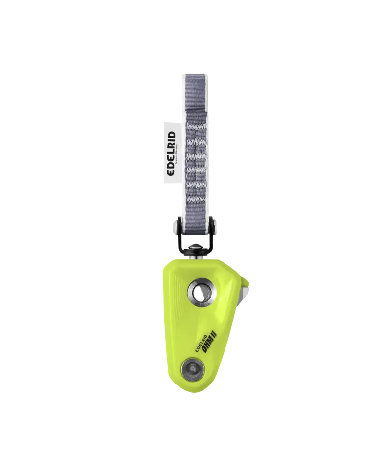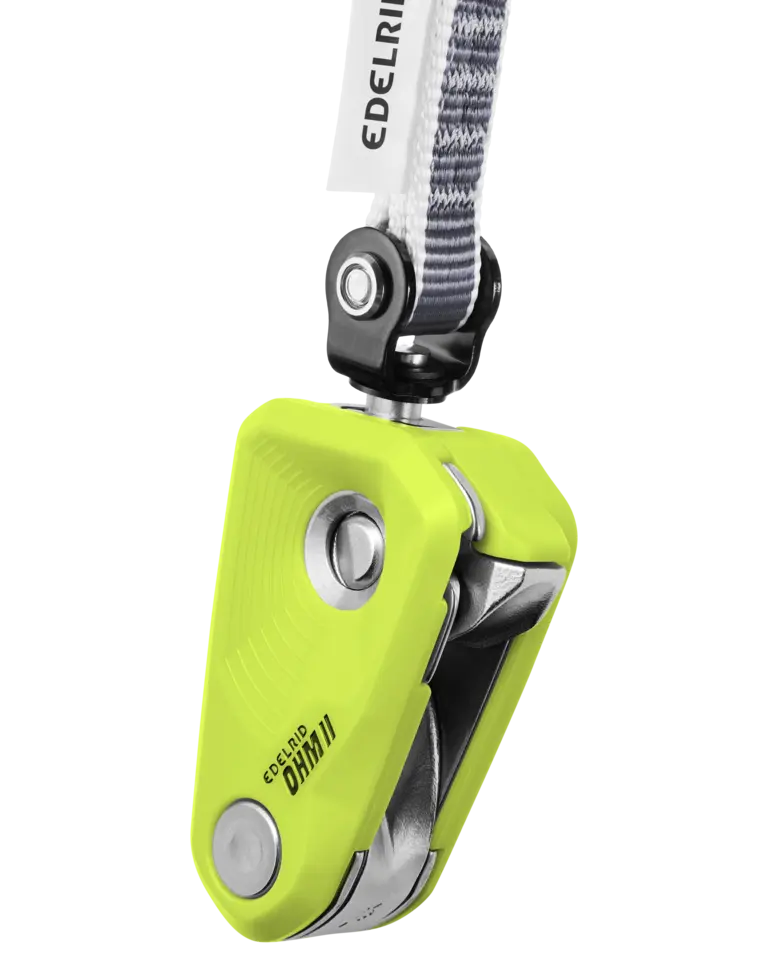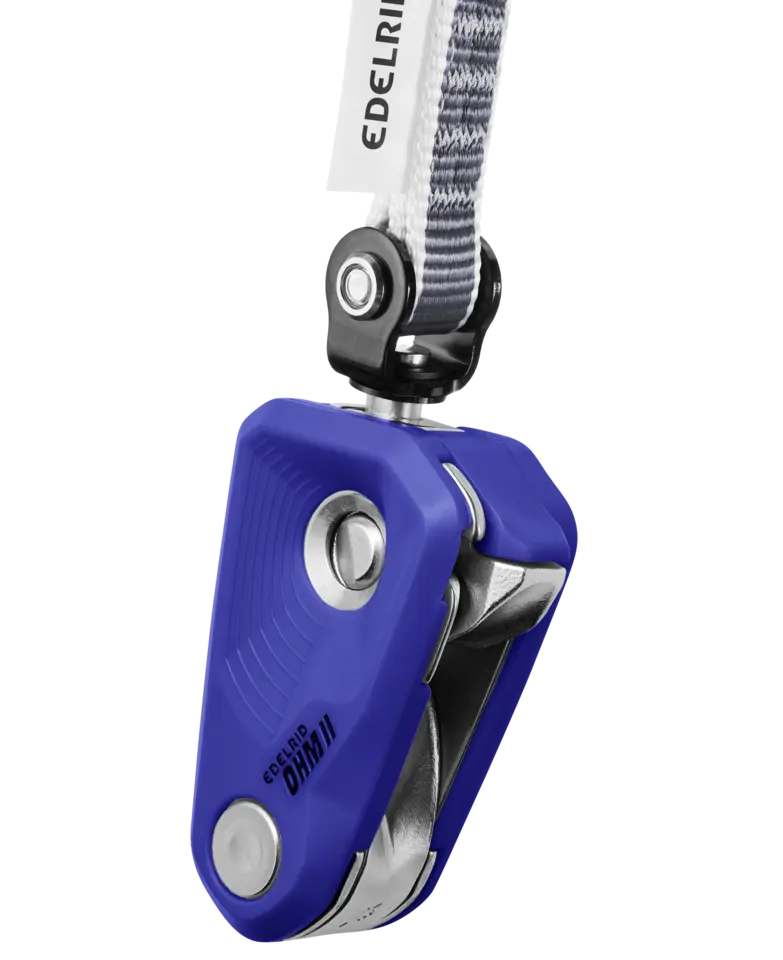 The design of the Ohm was underpinned with scientific research at the Institute of Mechanical Handling and Logistics (IFT), Stuttgart, Germany. It is an assisted braking resistor which is attached to the first bolt in the safety chain. In the event of a fall, the rope is pulled into the braking unit of the device and the fall is progressively arrested. This means the OHM does not brake the rope abruptly, but incrementally, so that the fall can be dynamically caught by the belayer. The OHM increases the friction in the safety chain, regardless of which belay device is used. This means the belayer has to apply considerably less manual force to the brake-side of the rope and is not suddenly pulled upwards or against the wall.