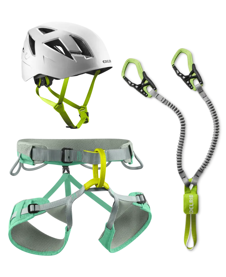 Complete set for women with a via ferrata lanyard, harness, and helmet