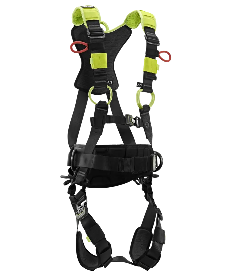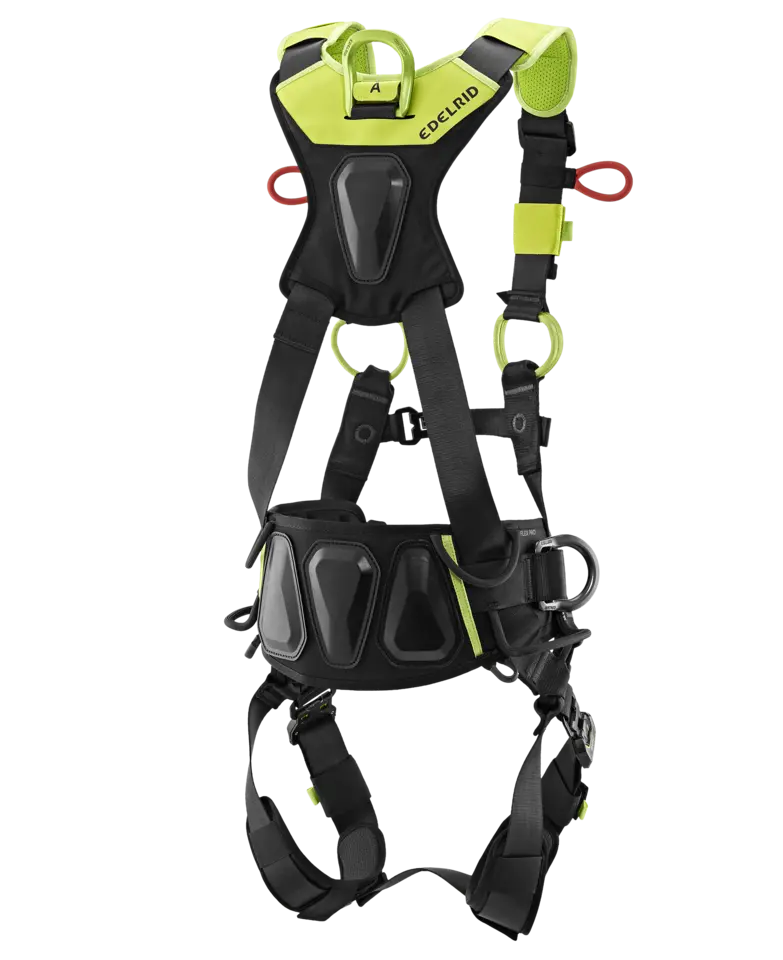 Der FLEX PRO ist ein komfortabler und umfangreich ausgestatteter Auffanggurt für komplexe Arbeiten in der Höhe und im absturzgefährdeten Bereich. Der Hüftgurt ist anatomisch vorgeformt und bietet mit vier Materialschlaufen ausreichend Stauraum für Verbindungsmittel und Werkzeug. Der metallene dorsale D-Ring kann je nach Bedarf „aufgestellt“ werden (per Klettverschluss in der Position arretierbar) oder vertikal beweglich sein. Protektoren am Rücken und an der Hüfte schützen das Textil und erlauben ein besseres Entlanggleiten an Strukturen bspw. in engen Schächten.