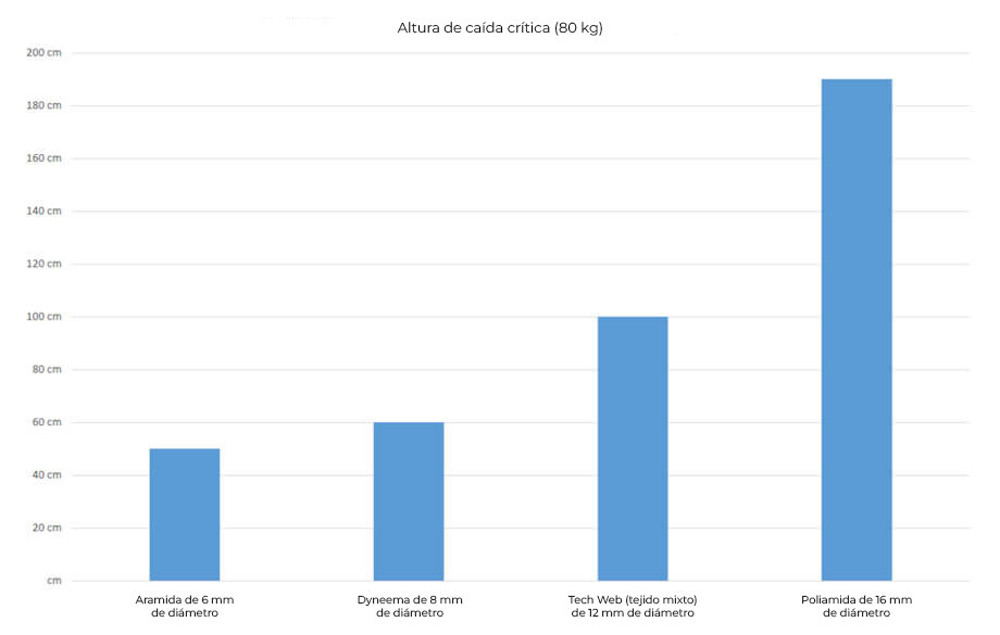 BU: Altura de caída, con un peso de 80 kg, a la que una cinta de autoaseguramiento (longitud de 120 cm) con un nudo de as de guía en el punto de encordada se rompe. Se muestran diferentes materiales.