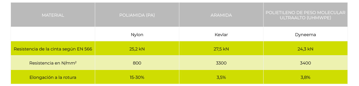 En resumen, se puede observar que las cintas de Dyneema, y especialmente las de aramida, fallan significativamente antes que las de poliamida. Esta diferencia se explica por la elongación a la rotura considerablemente menor de Dyneema y aramida en comparación con la poliamida (ver tabla 1). La poliamida se estira mucho más antes de alcanzar su resistencia a la rotura que la aramida y el Dyneema, absorbiendo así más energía antes de romperse. Sin embargo, los valores de la fuerza de impacto en la poliamida también aumentaron rápidamente hasta un nivel incompatible con el cuerpo humano.
