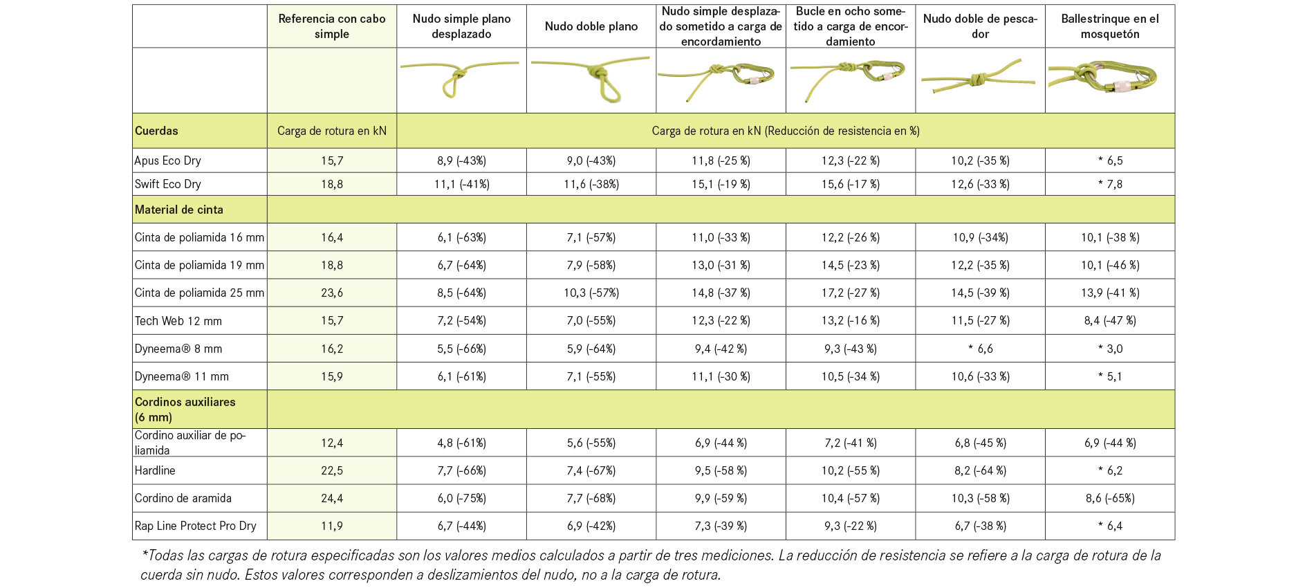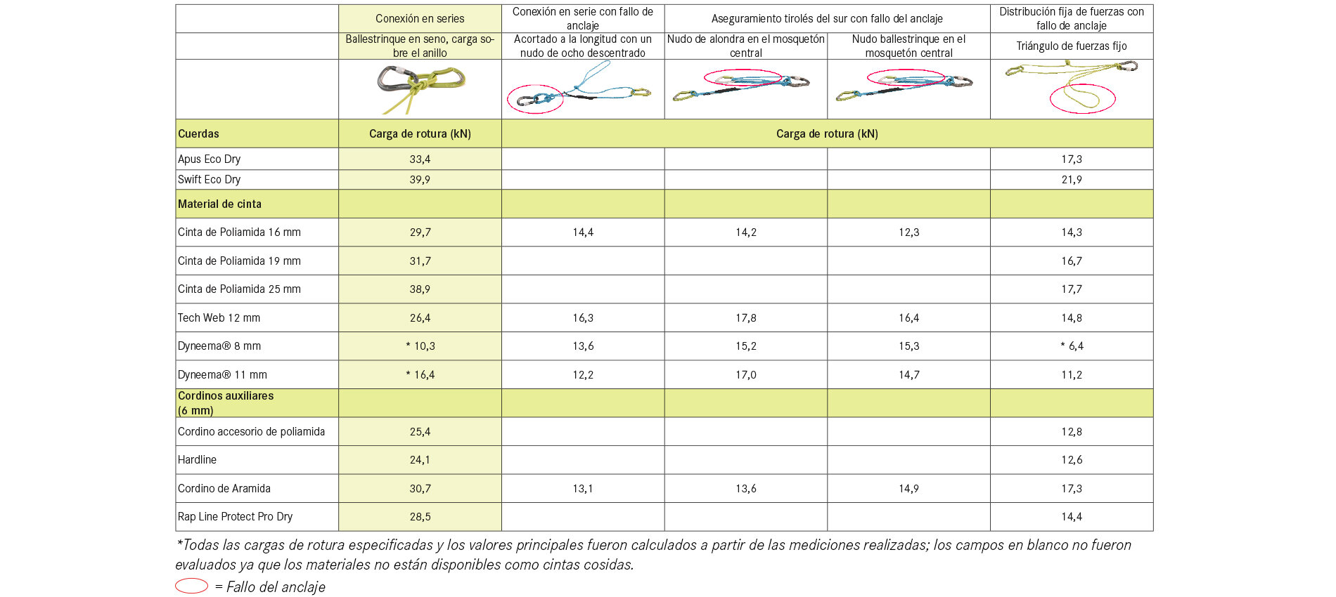 Se realizaron pruebas utilizando dos cuerdas y todos los tipos comunes de cintas, cordones accesorios y eslingas EDELRID.