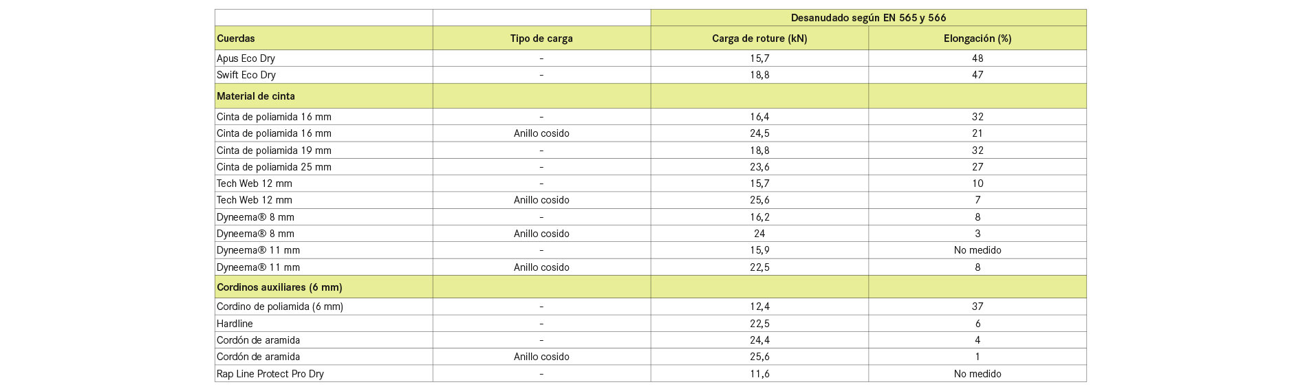 Los materiales de cinta probados fueron cintas de poliamida con un ancho de 16, 19 y 25 mm, cintas de tejido compuesto Tech Web de 12 mm de ancho con funda de poliamida y núcleo de Dyneema®, y cintas de Dyneema® con un ancho de 8 y 11 mm. Sin embargo, a pesar del nombre común, la cinta de Dyneema® de 11 mm es en realidad una cinta de tejido compuesto que contiene un 57% de poliamida.