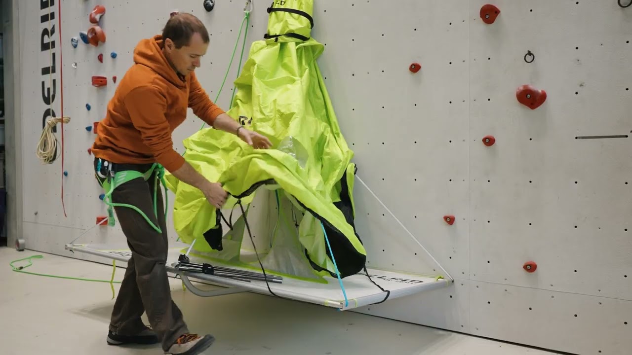 ¡El sobretecho impermeable para el LITERIDER LEDGE! Cuando la tormenta arrecia o la lluvia empieza a caer, el FLY del LITERIDER LEDGE despliega todo su potencial: un refugio seco en plena pared que, además, sorprende por el generoso espacio interior. Sentados, caben cómodamente cuatro personas; tumbados, dos. Su estructura de varillas ultraligeras sustituye la clásica forma en A, lo que da lugar a un interior notablemente más amplio. Gracias a esta construcción innovadora, es posible sentarse erguido en todas las esquinas del portaledge, y no solo, como suele ocurrir, en el lado junto a la pared. El acceso es posible por ambos lados cortos. Además, dos generosas aberturas de ventilación tipo chimenea garantizan una circulación de aire óptima. A través de la ventana panorámica frontal, quienes están en el portaledge disfrutan de una vista privilegiada en plena pared. Gracias a sus costuras termoselladas y al uso de materiales impermeables con una columna de agua de 20.000 mm, el FLY es completamente resistente a la intemperie y soporta incluso fuertes ráfagas de viento: un cordón perimetral, manipulable desde el interior, mantiene el viento fuera del habitáculo, mientras que un doble tensado dispuesto en diagonal reduce significativamente el aleteo del sobretecho en condiciones ventosas. Tanto las varillas longitudinales del lado de la pared como las esquinas están reforzadas con una resistente protección contra la abrasión. Y si el tiempo se muestra indeciso, el FLY puede guardarse en su funda de compresión y colocarse fácilmente entre el LITERIDER LEDGE y el punto de anclaje, listo para desplegarse en cuestión de segundos.