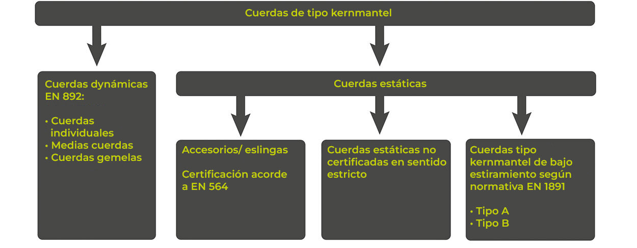 La gama de cuerdas kernmantle de EDELRID incluye desde cuerdas hechas 100 % de poliamida o poliéster hasta productos especializados con fibras de aramida o Dyneema® para mejorar la resistencia y durabilidad en diversas aplicaciones.