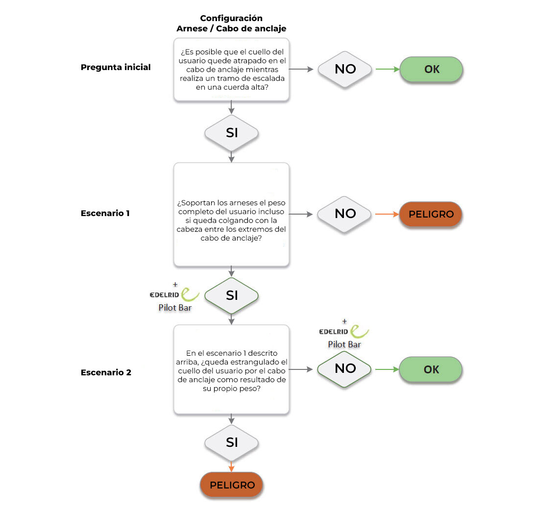 Para mayor claridad y para reducir la complejidad, EDELRID ha creado un diagrama de flujo de verificación rápida para ayudar a los constructores/operadores del parque a evaluar los riesgos potenciales. Tenga en cuenta que EDELRID no tiene influencia directa en el diseño y construcción del parque, por lo que recomienda una reevaluación exhaustiva en estrecha cooperación con el constructor, operador y fabricante del EPP.