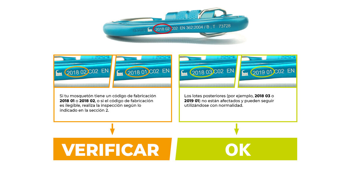 Este aviso preventivo de inspección de seguridad afecta a mosquetones con los códigos de fabricación 2018 01 y 2018 02. Se trata de los primeros lotes de producción de este modelo de mosquetón. No existen lotes anteriores. Los lotes posteriores (por ejemplo, 2018 03 o 2019 01) no están incluidos en este aviso preventivo.