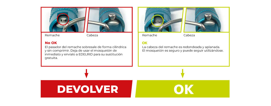 Un mosquetón afectado debe dejar de utilizarse de inmediato y debe ser devuelto a EDELRID para su sustitución gratuita.