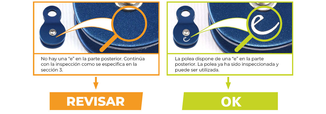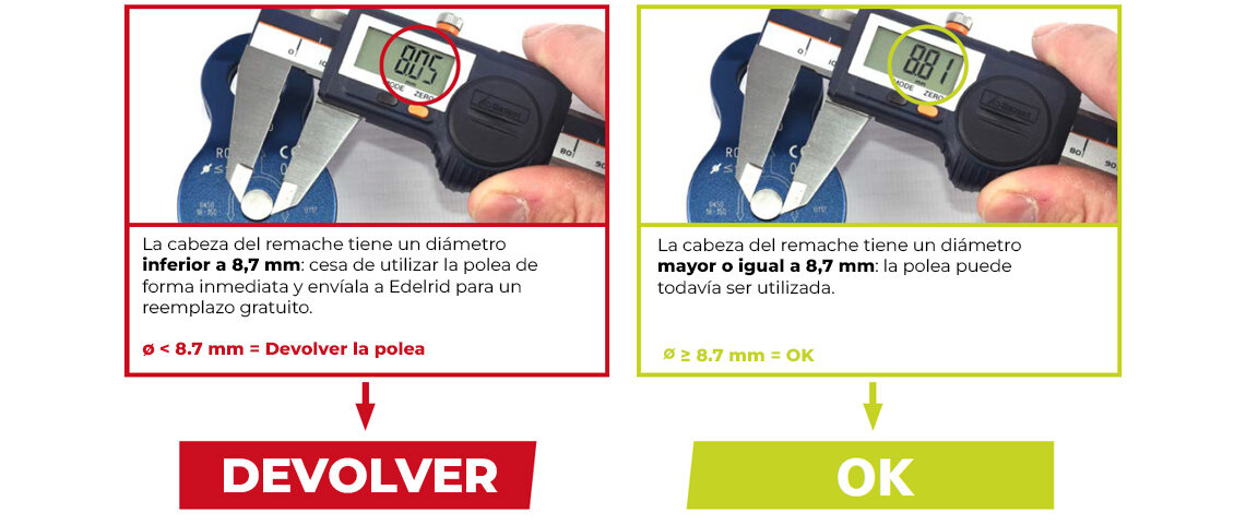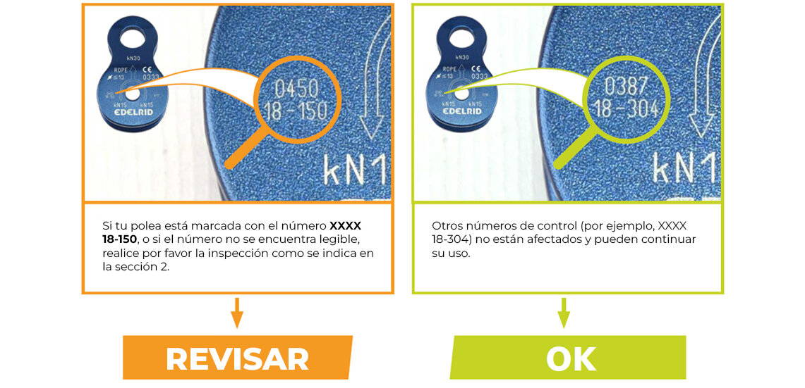 En interés de la seguridad del cliente, EDELRID ha decidido emitir este llamado precautorio para inspección de seguridad/inspección del usuario. Se solicita a los propietarios de poleas "Turn" con el número de lote XXXX 18-150 que verifiquen si la cabeza del remache en la placa lateral tiene un diámetro mínimo de 8,7 mm.