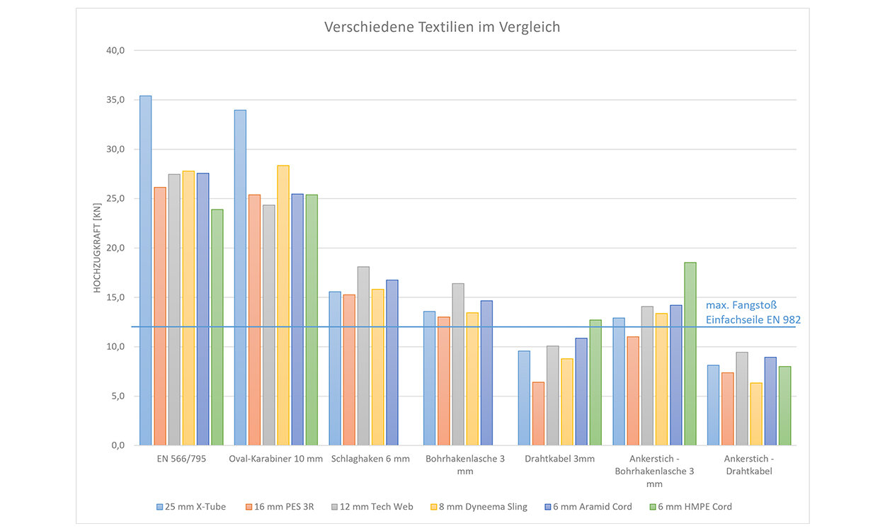 Die Versuche wurden an einer Zugprüfmaschine mit einer Geschwindigkeit von 500mm/Min durchgeführt. Als Referenz diente die normgerechte Prüfung nach EN 566 und EN 795, bei der Schlingen und textile Anschlagmittel über zwei Stahlbolzen mit 10 mm Durchmesser belastet werden. Anschließend wurden identische textile Anschlagmittel über unterschiedliche metallische Anschlagpunkte geführt (Karabiner, Bohrhakenlaschen, Drahtkabel, Ankerstich). Untersucht wurden eine 25 mm breite Polyamid-Schlinge (X-Tube), eine 16mm Polyester Schlinge (PES 3R Sling), eine 12 mm Schlinge mit HMPE-Kern und Polyester-Mantel (Tec Web Sling), eine 8 mm HMPE Schlinge (Dyneema Sling), eine 6 mm Schlinge aus Rundmaterial mit Aramid Kern (Aramid Cord) sowie eine 6 mm Schlinge aus Rundmaterial mit HMPE-Kern. Die ermittelten Höchstzugkräfte wurden mit der Referenz verglichen.
