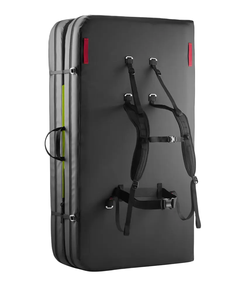 The MANTLE is a foldable all-round crash pad with excellent impact protection and practical details. Its 12-cm-thick, triple-layered design optimally absorbs fall energy and offers a safe landing surface. The ergonomic and fully detachable carrying system makes the crash pad easy to carry. Fifi hooks and clip-in buckles hold the mat together. The zipper on the underside enables shoes, chalk bags, and snacks to be stowed in the folded pad. This sophisticated connection system also makes it possible to safely and conveniently carry two mats. The zippered pocket is ideal for storing small items like car keys. Thanks to the integrated foot mat on the top of the crash pad, you can tackle your problems with clean shoes every time.