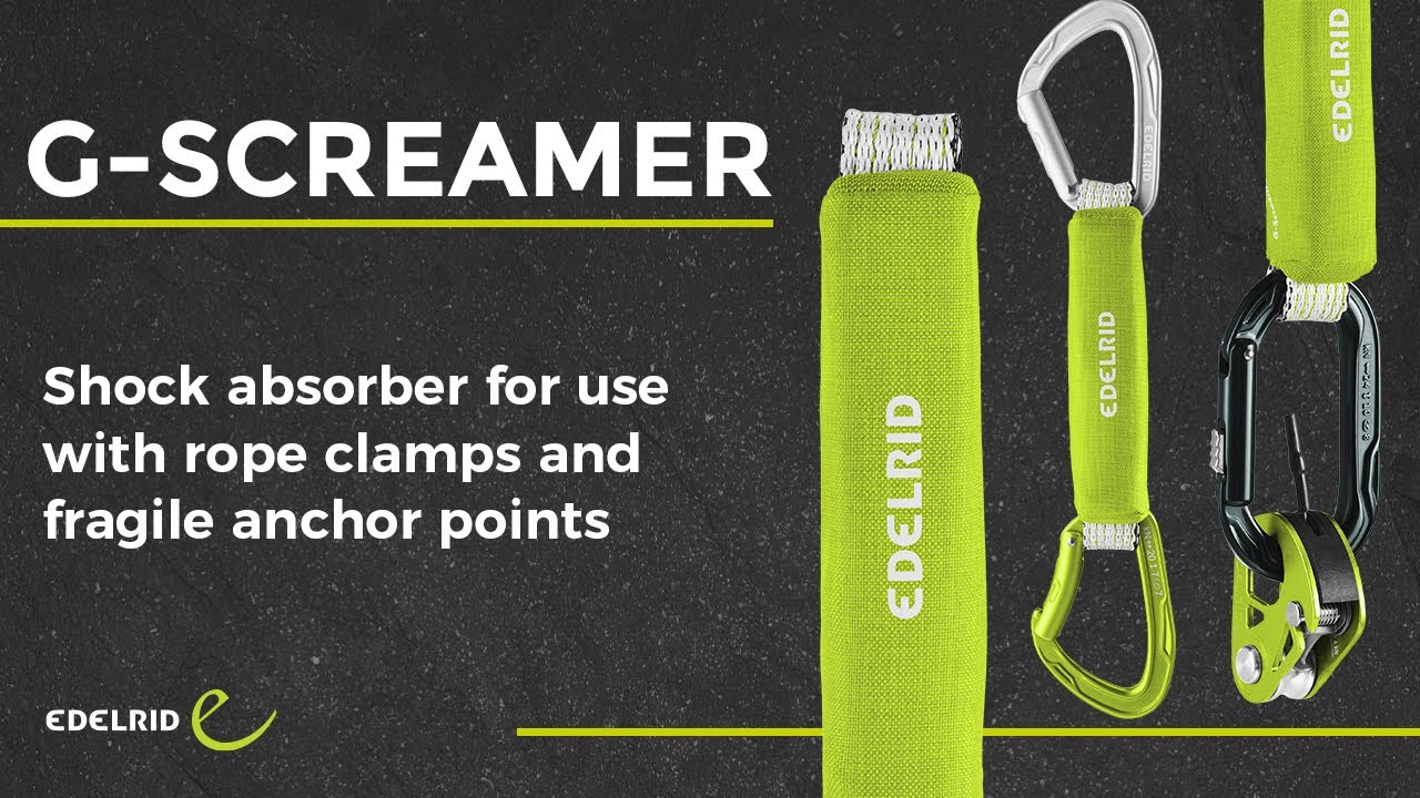 The G-SCREAMER is a small, light HMPE sling with an integrated, compact shock absorber that can offer important safety reserves in alpine terrain or when big wall or ice climbing. With a length of 15 cm, it is hung between two carabiners like a quickdraw sling and used as protection in the case of questionable anchor points and/or larger gaps so as to minimize the load on such anchor points. In the event of a fall, the shock absorber deploys, absorbing energy and reducing the impact force on the anchor point to less than 4 kN. The total length following the full deployment of the shock absorber is 100 cm. Thanks to its minimal weight of less than 50 g, the G-SCREAMER is only negligibly heavier than a conventional quickdraw sling while still offering a major safety reserve when attached to a harness. As an additional innovative use, when combined with rope clamps pursuant to EN 567, the G-SCREAMER fulfills the dynamic requirements established in EN 15151-1 (braking devices with manually assisted locking) so as to enable belaying with rope clamps. This combination vastly reduces the probability of rope damage if the follower falls.