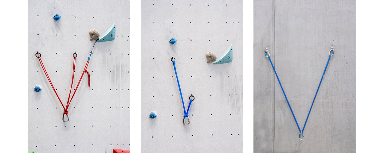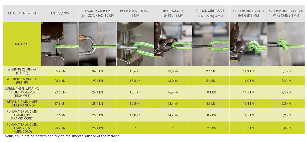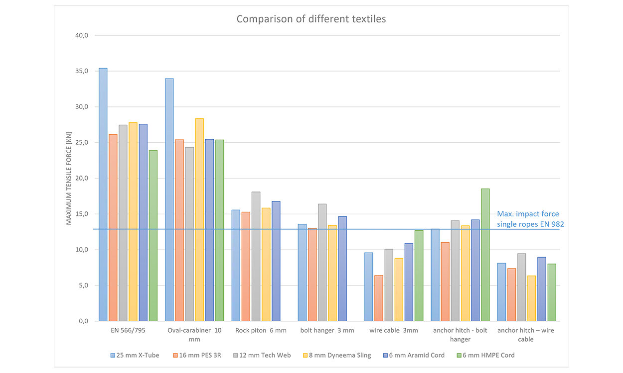The tests were carried out on a tensile testing machine at a speed of 500 mm/min. The standardised test according to EN 566 and EN 795, in which slings are loaded via two steel bolts with a diameter of 10 mm, served as a reference. Identical textile slings were then passed through different metal attachment points (carabiners, bolt hangers, chock wire cables, anchor stitches). A 25 mm wide polyamide sling (X-Tube), a 16 mm polyester sling (PES 3R Sling), a 12 mm sling with HMPE core and polyester sheath (Tec Web Sling), an 8 mm HMPE sling (Dyneema Sling), a 6 mm sling made of round material with an aramid core (aramid cord) and a 6 mm sling made of round material with an HMPE core. The maximum tensile forces determined were compared with the reference.
